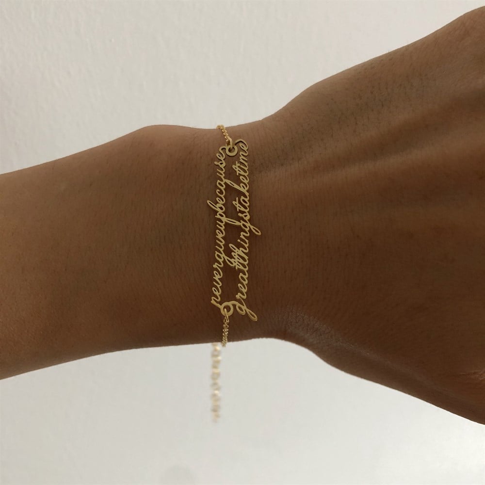 “never give up because great things take time.” örnek olarak yazılmıştır istediğinizi yazdırabilirsiniz.Gold-rose-silver renk seçeneği mevcuttur. Çift sıra bileklik fiyatıdır.