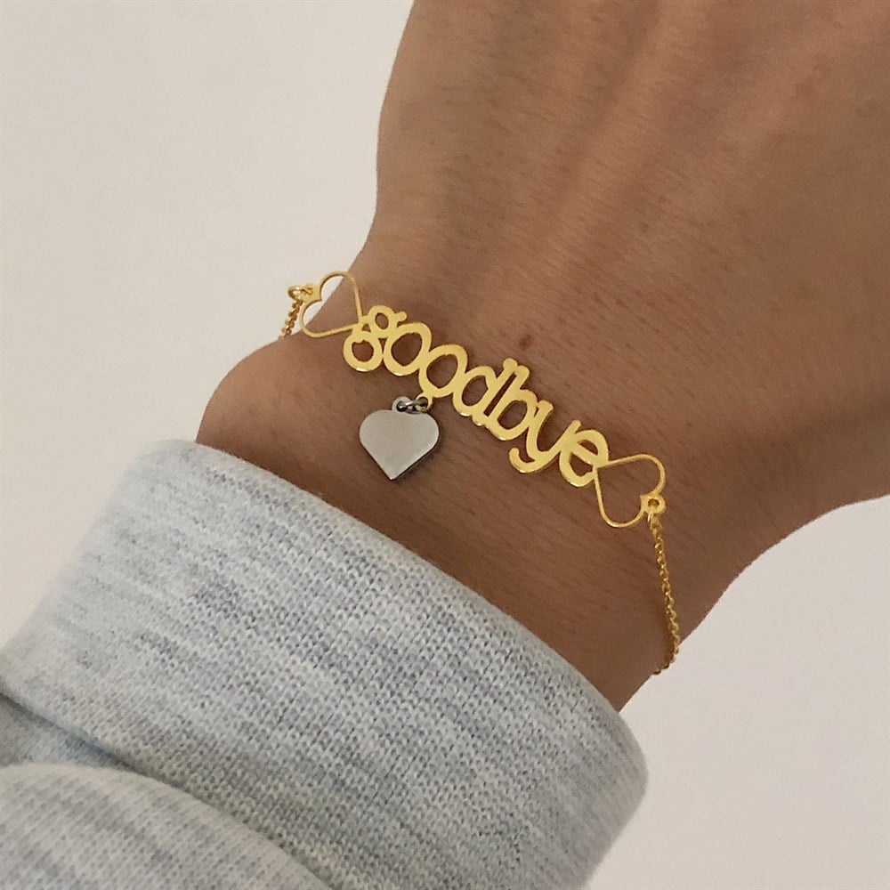 "Goodbye" ve kalp sembolü örnek olarak yapılmıştır. İstediğiniz kelime/sayıyı yazdırabilirsiniz. gold-silver-rose renk seçeneği mevcuttur. Tamamını aynı renk ya da iki farklı renk olarak seçebilirsiniz. Kalp sembolü yerine yıldız,güneş,burç,rakam,harf,kedi,güneş vb istediğiniz sembolü tercih edebilirsiniz.